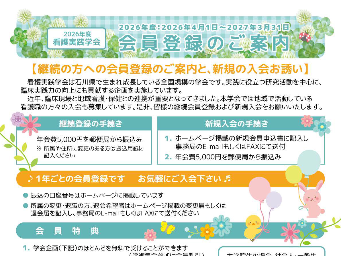 第19回看護実践学会学術集会 一般演題の募集(締め切り:令和8年4月28日)を開始しました。
